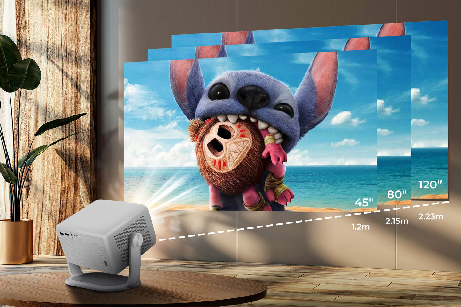 You can project from 40” up to 120” depending on the distance (1 to 4 meters). Even in tight spaces, you’ll enjoy a massive screen.